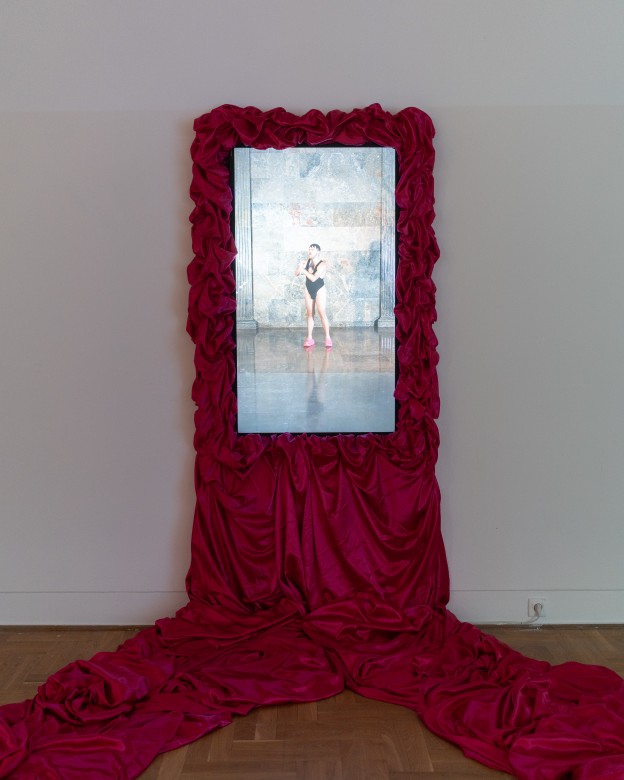 Tkanina z różowej satyny stanowi ramę dla performansu, integralną część wideoinstalacji — wylewa się z ekranu monitora i zawłaszcza przestrzeń, podkreślając pragnienie widzialności.